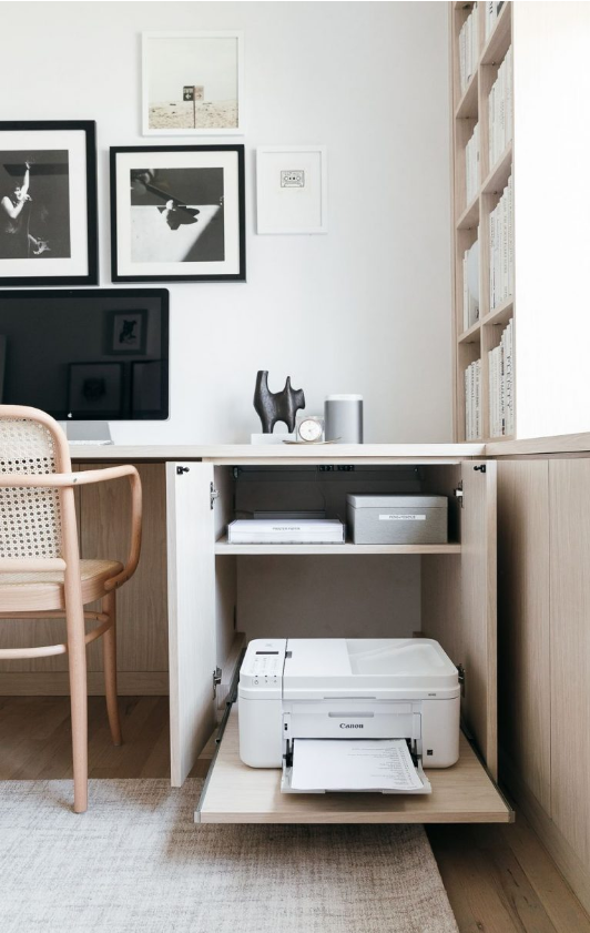 Мұнда көрсетілгендей жағымсыз принтерді жасыру үшін шкафтың ішіне тартылатын тартпа орнатқыңыз келуі мүмкін: