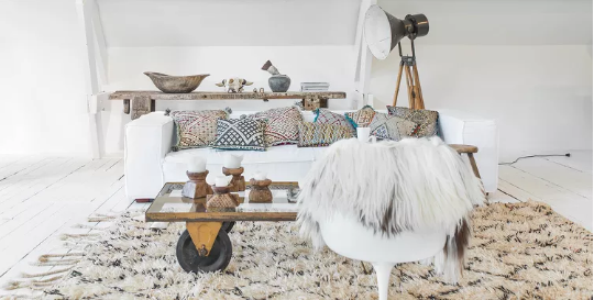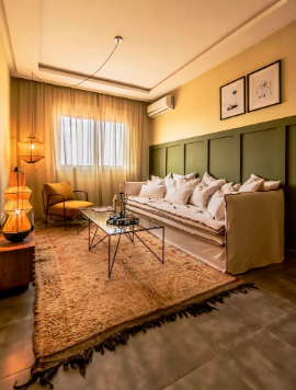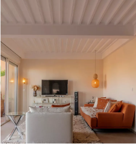 Интерьер дизайнері Soufiane Aissouni ұсынған бұл жеңіл және әуе Марракеш қонақ бөлмесінде ақшыл құм түсті қабырғалар, ақ боялған төбе арқалықтары, жылы жарықтандыру, заманауи жиһаздар және Марокко дизайнының белгісі болып табылатын дәстүрлі Бени Оурейн кілемі бар. кез келген заманауи интерьерде.
