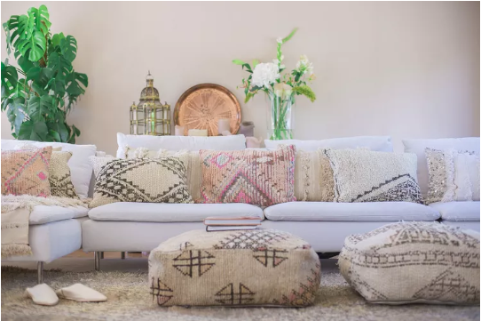 Осы заманауи қонақ бөлмесінде Дабито Ескі Бренд-Ньюда Imazighen кілемі және еден пуфтары сияқты мароккалық тоқыма бұйымдарымен жабдықталған, бірақ жанды кеңістік жасады. Дивандағы түрлі-түсті және өрнекті тоқыма бұйымдары қонақ бөлмесінің дизайнына жылулық пен қуаныш қосады.
