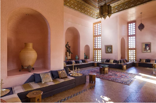 Марокконың марқұм бизнесмені Брахим Зниберге француз сәулетшісі Жан-Франсуа Зевако жасаған осы сәнді қонақ бөлмелері сияқты дәстүрлі Марокко қонақ бөлмелері биік оюланған және боялған төбелерсіз, драмалық терезелер мен архитектуралық аркаларсыз үлгі алу қиын. Бірақ сіз жарқын қызғылт қабырғалардан, перфорацияланған металл шамдардан және барқытпен қапталған банкеттерден шабыт алып, жеке қонақ бөлмеңізге Марокко элементтерін қосуға болады.
