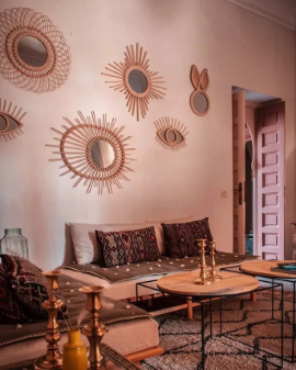 Марракештегі интерьер дизайнері Суфиан Айссуни осы жылы және тыныштандыратын қонақ бөлмені безендіру үшін Марокко қаласының ерекше қызыл балық қызғылт реңктерін пайдаланды. Текстуралы қабырға бояуы винтаждық стильдегі ротандық айналар топтамасы үшін әдемі фон жасайды және заманауи ағаш және металл кофе үстелдері дәстүрлі тоқыма бұйымдары мен отырғыштарды толықтырады.