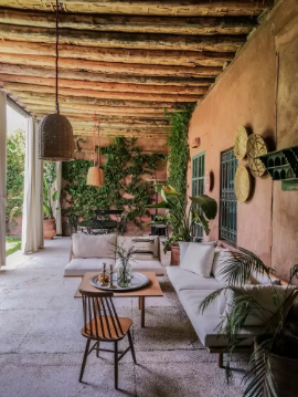 Марракештегі интерьер дизайнері Суфиан Айссунидің бірінші қабатындағы ашық қонақ бөлмесінде ортағасырлық және скандинавиялық жиһаздармен, тоқылған аспа шамдарымен және өрмелеу жүзімдері мен тоқылған себеттердің қоспасы бар, олар тасымалданатын текстуралы қызғылт қабырғаларды безендіреді. үйдің ішкі бөлігіне. Сыртқы кеңістікті қатты сәулелерден көлеңкелеу немесе құпиялылықты қамтамасыз ету үшін еденнен төбеге дейінгі перделерді тартуға болады.