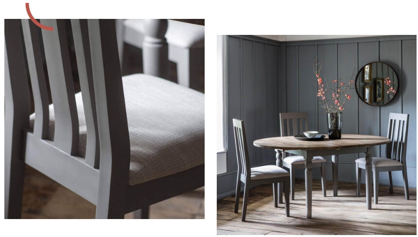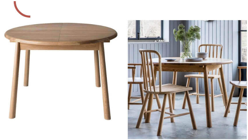 Төзімді емен шпонынан және қатты емен негізінен жасалған дәстүрлі дизайн, бұл ұзартылатын асхана қажет болғанда 1,2 м-ден 1,55 м-ге дейін созылады. Үстел әртүрлі үй декор схемаларына сәйкес келетін стильді сұр түсті шифер немесе ауылдық түтін еменінде қол жетімді. Жиынтық ретінде сатып алғанда, екі асхана үстелі де ыңғайлы жастықтармен аяқталған сәйкес келетін орындықтармен бірге келеді.