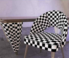 ឈុតតុបរិភោគអាហារដ៏អស្ចារ្យនេះមានកៅអីអង្គុយធ្វើពីថ្មម៉ាប និងបាតដែកដែលមានជើងកោង ដែលមិនដូចការរចនាតុបរិភោគអាហារដែលអ្នកបានឃើញពីមុនមក។ កៅអីស្បែកធ្វើពីក្រណាត់ប្រណិត បន្ថែមនូវរូបរាងដ៏ប្រណិតនៃឈុតនេះ។