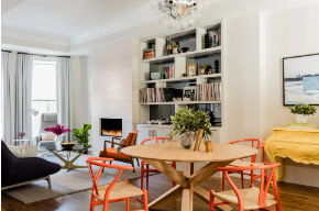 ພື້ນທີ່ຮັບປະທານອາຫານຂອງເຮືອນຫຼັງນີ້ໃນເຂດ South End ຂອງ Boston ໂດຍ Elms ການອອກແບບພາຍໃນແມ່ນເປັນສິ່ງມະຫັດສະຈັນໃນສະຕະວັດກາງ. ໂຕະອາຫານທີ່ເຮັດດ້ວຍໄມ້ກົມທີ່ມີຮູບສີ່ຫຼ່ຽມມົນ, ພື້ນຖານເລຂາຄະນິດຖືກຈັບຄູ່ກັບຊຸດເກົ້າອີ້ປີກປີກສີສົ້ມ, ໃນຂະນະທີ່ໂຕະຄອນໂຊສີເຫຼືອງໂຄ້ງເພີ່ມຄວາມຮູ້ສຶກມ່ວນຊື່ນໃຫ້ກັບຫ້ອງ.