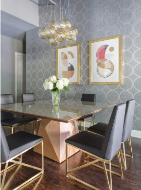 ນີ້ອາດຈະເປັນກໍລະນີຂອງຜູ້ອອກແບບຂອງ "ທຸລະກິດຢູ່ທາງຫນ້າ, ພັກໃນດ້ານຫລັງ." ພື້ນຖານທີ່ຜິດປົກກະຕິທີ່ມີສອງ loops ເງິນແມ່ນສິ່ງທີ່ເຮັດໃຫ້ຕາຕະລາງ dining ໃນຫ້ອງນີ້ໂດຍ Maine Design ໂດດເດັ່ນ. ໃນຂະນະທີ່ສ່ວນທີ່ເຫຼືອຂອງຫ້ອງຮັບປະທານອາຫານ Beverly Hills ນີ້ປະສົມປະສານແບບທັນສະໄຫມແລະແບບດັ້ງເດີມໄປສູ່ຜົນກະທົບທີ່ດີເລີດ, ຕາຕະລາງເຮັດສໍາເລັດມັນໃນຊິ້ນດຽວກັນ.