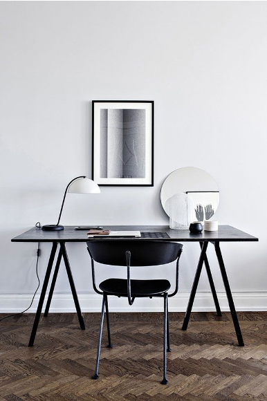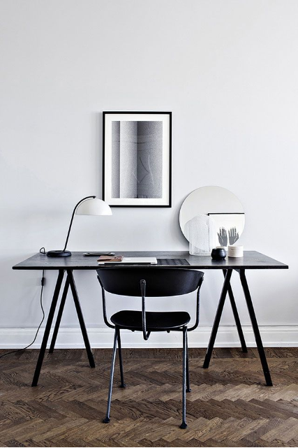 Սկսեք գրասեղանից: Գնացեք պարզ սև գրասեղանով՝ սպիտակ պատի դեմ հակադրություն ստեղծելու համար, ինչպես երևում է այստեղ: