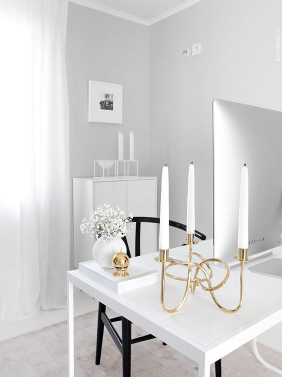 Մինիմալիստական գրասենյակին ջերմություն հաղորդելու մեկ այլ միջոց է արույրի և ոսկեգույն շեշտադրումների օգտագործումը: