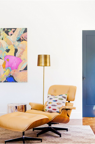 This tan leather Eames lounge chair and footrest certainly makes a statement in this room, next to a brass floor lamp: