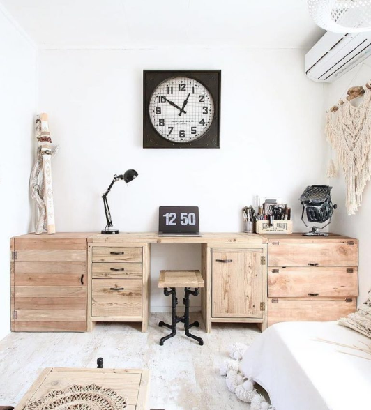 Industrial home offices aren’t all dark and moody. This is an example of a bright white industrial office design with light wood furniture and white walls. It does have a few darker accents like the iron metal wall clock and the black task lamp on the desk, but other than that, this room is quite light and airy!