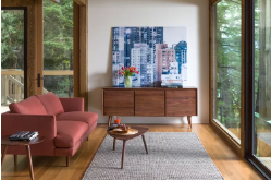 The room setting featured here is stylish and sophisticated at the same time. The sofa is the wow factor in the room, and everything else around it is neutral tones with the gray rug and the walnut accent pieces which help to balance the high energy of the sofa – making g charismatic and intriguing rather than overbearing and out of place. In this room, the mid-century pieces are made from solid woods like walnut and cherry, and the angled legs and rounded corners of these pieces soften the overall look of the room by adding in just a few much-needed curves and angles.