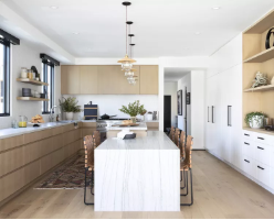 In the same vein, natural wood cabinetry is coming back front and center. Crockett notes how homeowners are moving away from stark white kitchens and shifting towards warmer color palettes and natural wood materials in cabinetry.