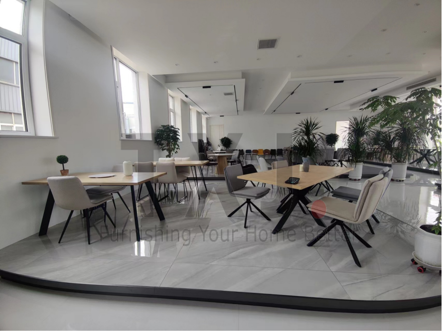 And we have arranged different product areas carefully , such as sintered stone table area, wood veneer table area, coffee table area, dining chair area, etc. We also respect the habits of friends from different regions, so we have equipped with a coffee machine. In our water bar, there are juice, Perrier, cola and more. We not only provide customers with high-quality products, but also hope to make them feel our sincerity through high-quality service.