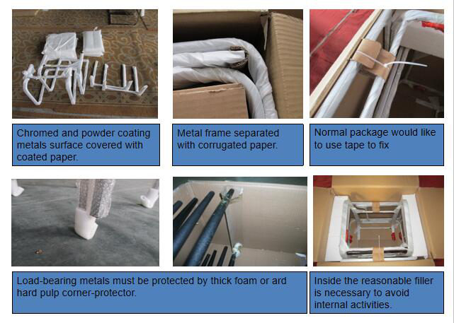All the upholstery must be packaged with coated bag, and load-bearing parts be foam or paperboard.It should be separated with metals by packing materials and the protection of metals’ parts which are easy to harm upholstery should be strengthened.